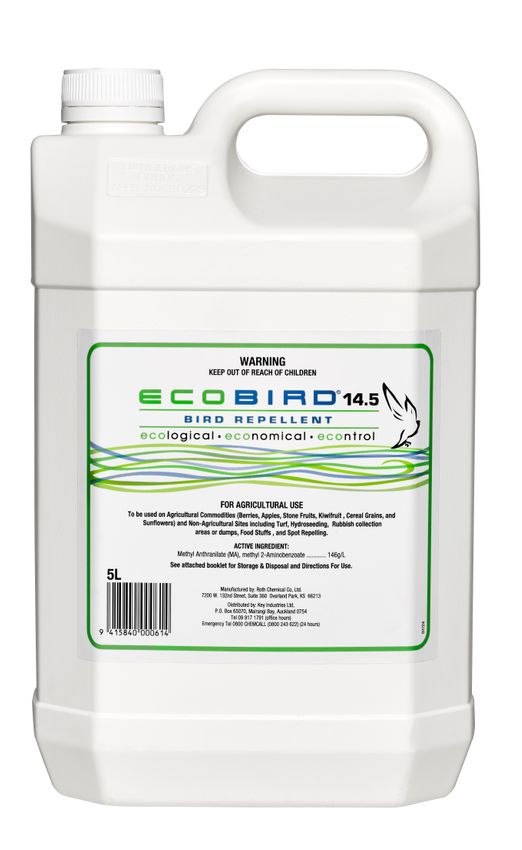 EcoBird 14.5 is an oil-based Methyl Anthranilate (MA) bird repellent for use on commercial horticultural and agricultural crops to limit damage caused by birds on ripening crops.