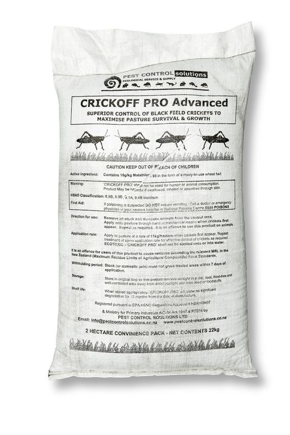 Crickoff Pro Cricket Bait has been specifically developed for superior and sustained control of the introduced Black Field Cricket in all New Zealand environments. Its superior palatability and efficacy will result in rapid knockdown and control of the target pest ensuring maximum pasture survival and growth.