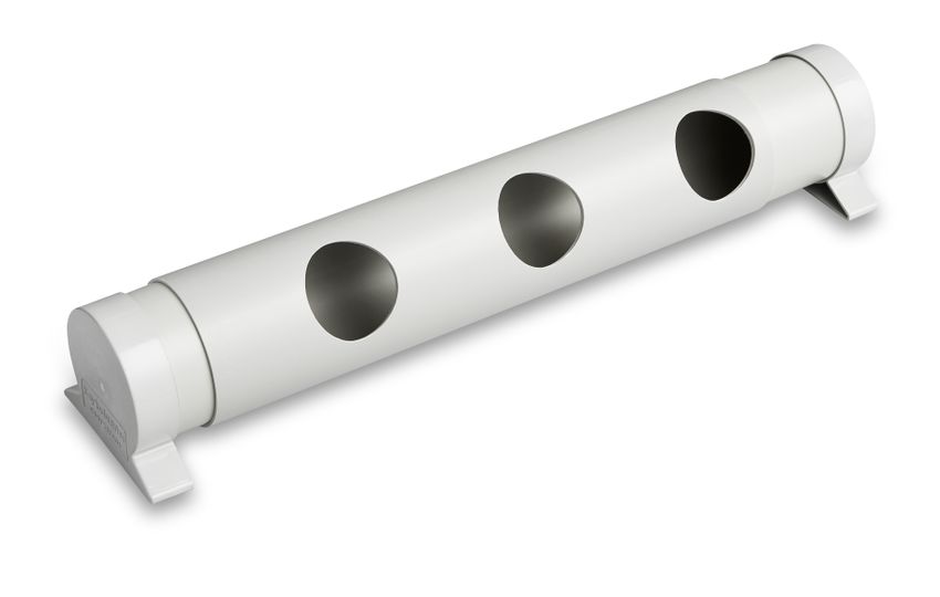 A cylindrical polythene tube sealed at each end with opening and closing feeding and filling ports along one side. A rotating and sliding adjustable outer sleeve opens and closes the station by aligning or misaligning the portholes. A safe and efficient poison bait dispenser that holds 2kg of bait suitable for Rabbits. Simple & effective, Child Safe, Stock Safe.