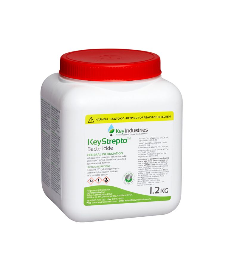 KeyStrepto is manufactured in New Zealand for Key Industries Ltd. Approved for use by the NZ Food Safety Authority. Approved for use by the NZ Environmental Protection Agency. Approved for use by the Agricultural Compounds and Veterinary Medicines Board. Active ingredient: contains 170 g/kg streptomycin as the sulphate salt in the form of a wettable powder.